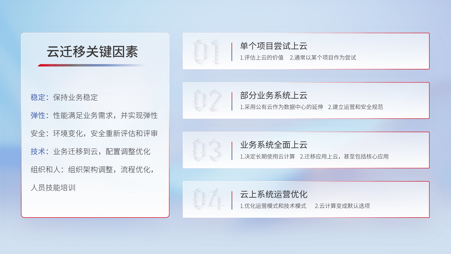 结合实际业务,,,从规划设计、、云平台选型、、云原生改造、、数据迁移、、、、集成交付,,,迁移全过程为客户识别最佳上云路径,,做好风险识别管理,,设计网络架构、、身份权限、、安全审计合规、、、操作审计、、、日志审计、、监控告警策略、、、多站点容灾设计等,,,,对云上基础设施进行整体规划,,提升IT治理水平,,以满足弹性、、、、高可用、、、、高性能的需求。。