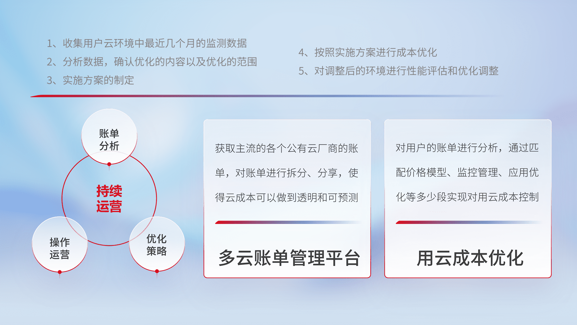 通过多云纳管,,以统一的资源数据模型把客户的云资源进行抽象和封装,,进而实现对多云资源的统一操作,,,保障云资源管理的可靠性、、、、稳定性与可用性。。量身定制化运维内容,,,配置、、、、开发运维、、、、补丁管理、、备份、、、监控、、、、认证和访问管理、、、审计和日常巡检等,,保障在用云过程中的可靠度,,,,稳定度以及高可用率。。。。